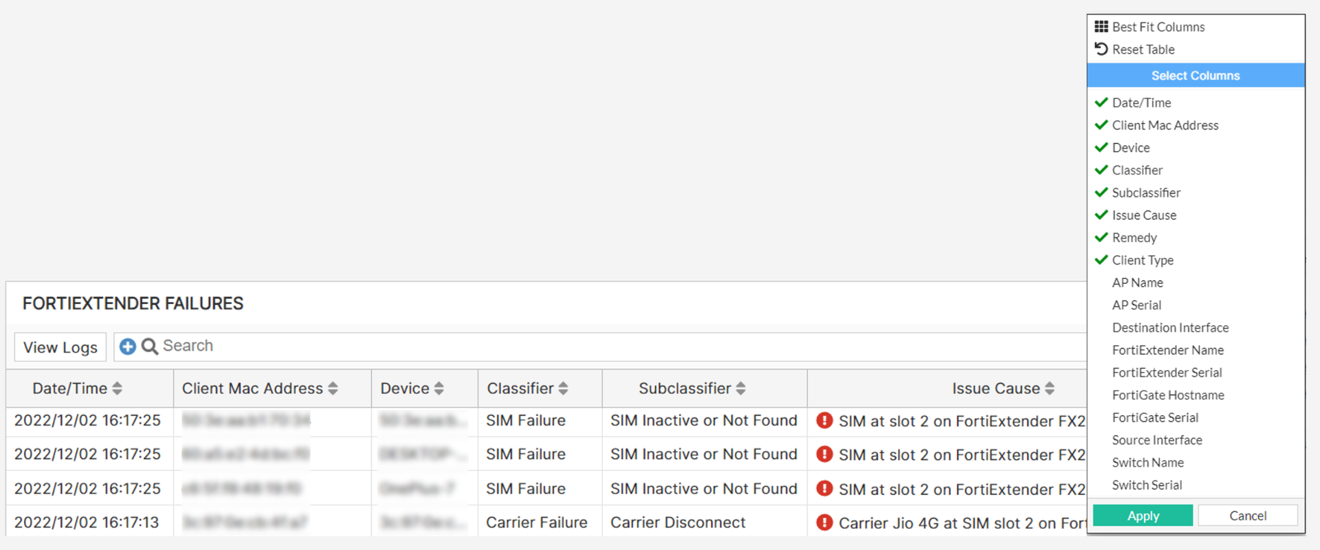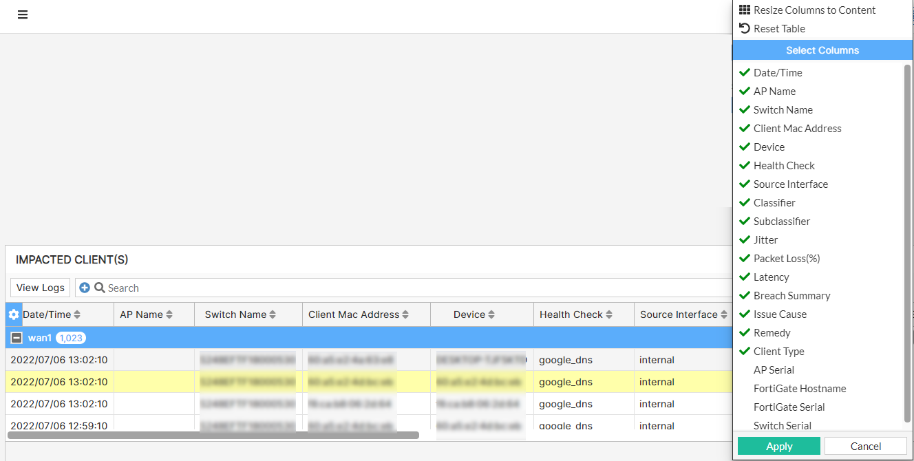 | Issue Cause | The detailed cause of the SLA breach that impacted the client/AP/FortiGate/FortiExtender. |