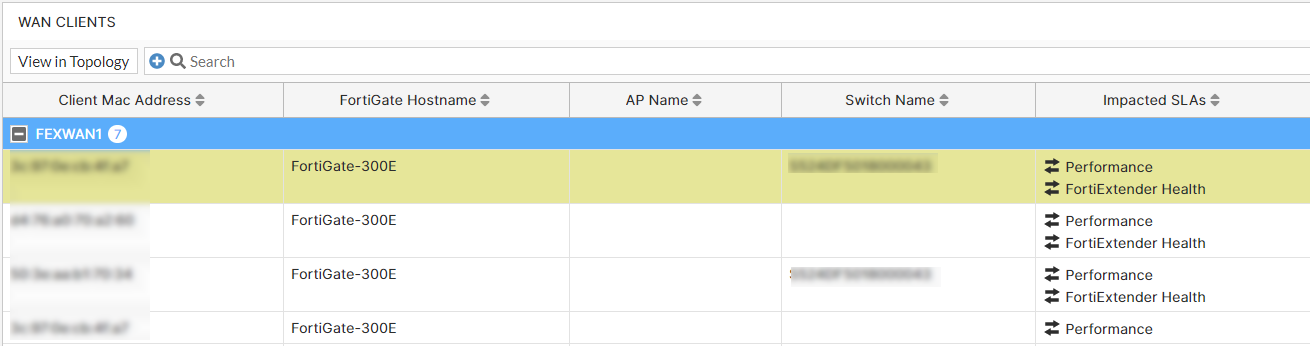 The following example displays the WAN Clients with information such as the FortiGate host name, serial number, and IP address, AP name, IP address, and serial number, switch name, IP address, and serial number, client MAC address, interface details, and the impacted SLAs. Select any row and click View in Topology to view the associated details.