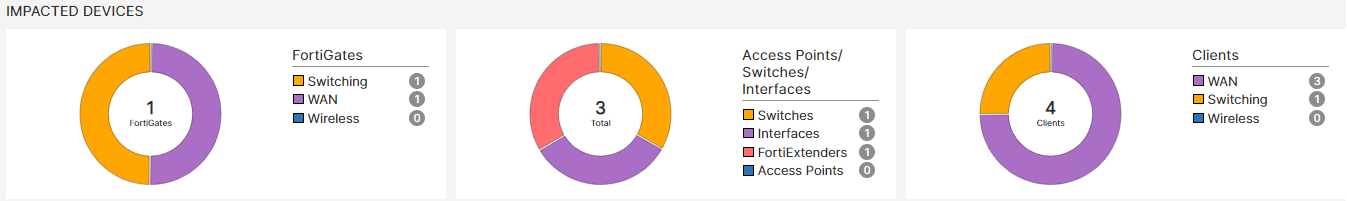 Displays the number of devices, that is, APs, interfaces, FortiExtenders, and switches with impacted clients.