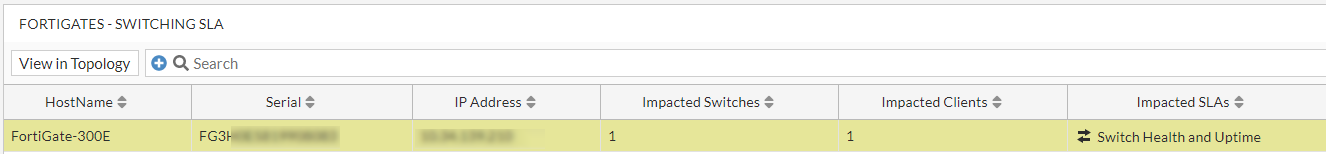 The following example displays the Switches with information such as the switch host name, IP address, OS version, and serial number, FortiGate host name, serial number, and IP address, and lists the impacted clients and SLAs along with the status and state of the switch. Select any row and click View in Topology to view the associated details.