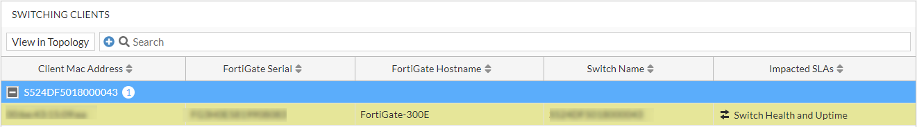 The following example displays the Switching Clients with information such as the FortiGate host name, serial number, and IP address, switch name, IP address, OS version, state, and status, client MAC address, and the impacted SLAs. Select any row and click View in Topology to view the associated details.
