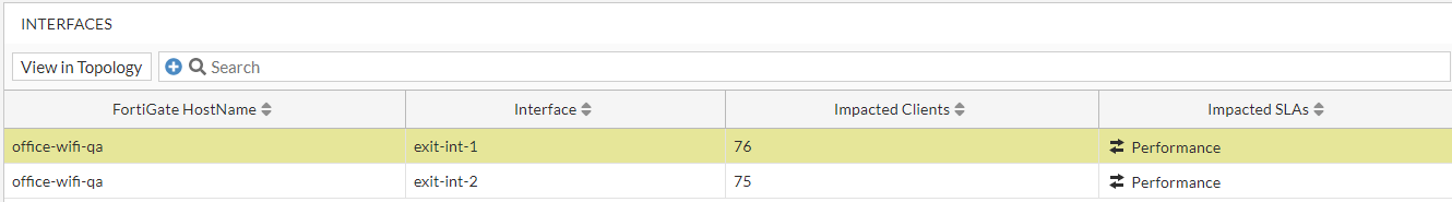 The following example displays the Interfaces with information such as the interface, FortiGate host name, serial number, and IP address, and lists the impacted clients and SLAs. Select any row and click View in Topology to view the associated details.