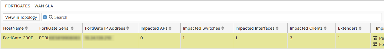 The following example displays the FortiGates-WAN SLA with information such as FortiGate host name, serial number, and IP address, and lists the impacted APs, clients, SLAs, switches, and interfaces. Select any row and click View in Topology to view the associated details.