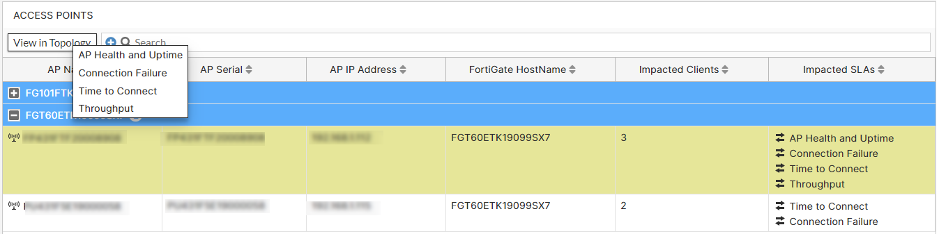 The following example displays the Access Points with information such as AP name, serial number, and IP address, FortiGate host name and IP address, and lists the impacted clients and SLAs. Select any row and click View in Topology to view the associated details.