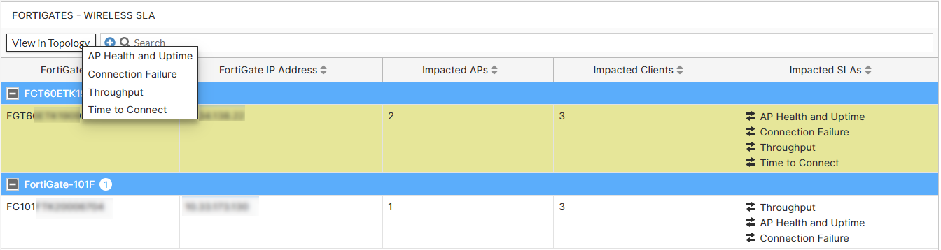 The following example displays the FortiGates-Wireless SLA with information such as FortiGate host name, serial number, and IP address, and lists the impacted APs, clients, and SLAs. Select any row and click View in Topology. You are prompted to select an SLA. Data is displayed for FortiGate wireless clients based on the selected SLA breaches only.