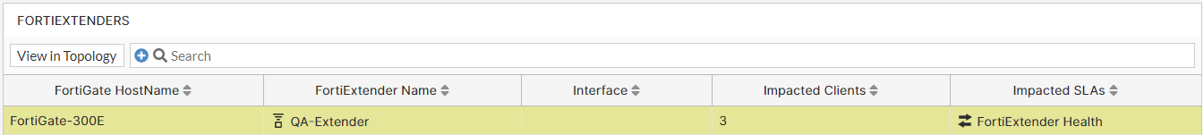 The following example displays the FortiExtenders with information such as the interface, FortiGate host name, and FortiExtender name, and lists the impacted clients and SLAs. Select any row and click View in Topology to view the associated details.