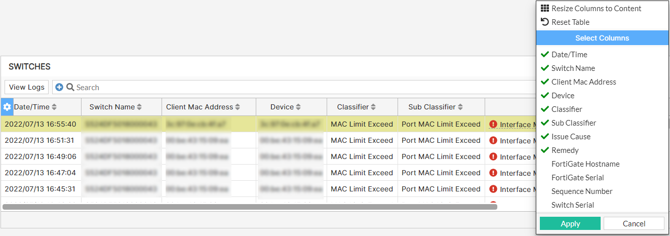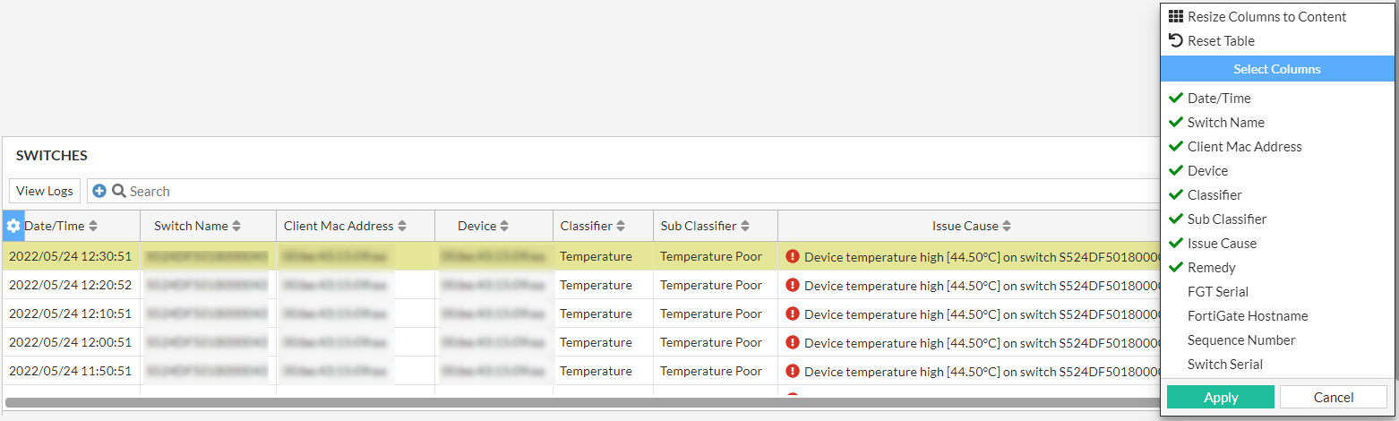 The Switches table displays information such as the switch details for reported classifiers and sub-classifiers, issue description and the suggested remediation measure, and so on are displayed.
