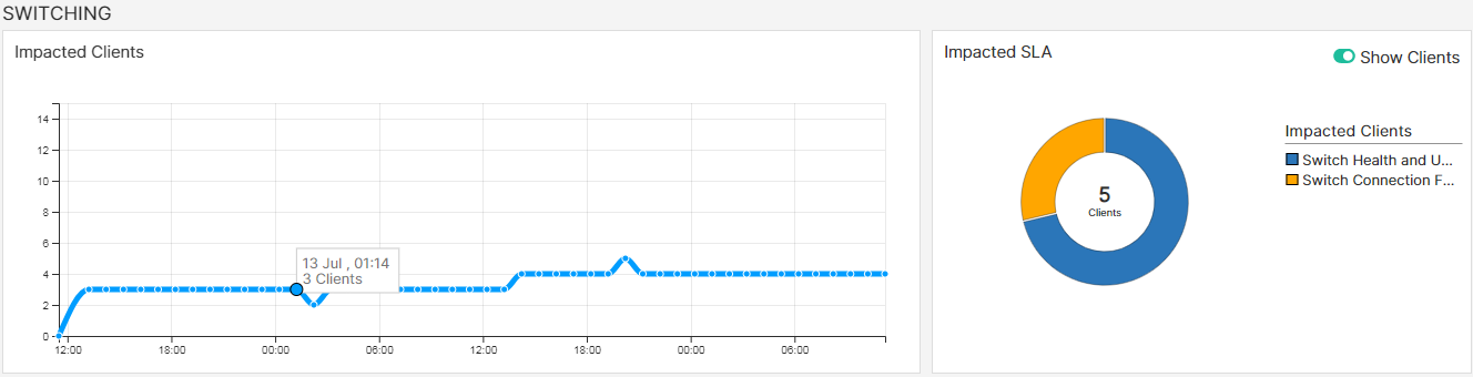 The Switching panel displays the total number of impacted clients and SLA data. In the impacted SLA panel, you can select Show Clients to view the impacted client count or click Show Switches to view the impacted switch count.
