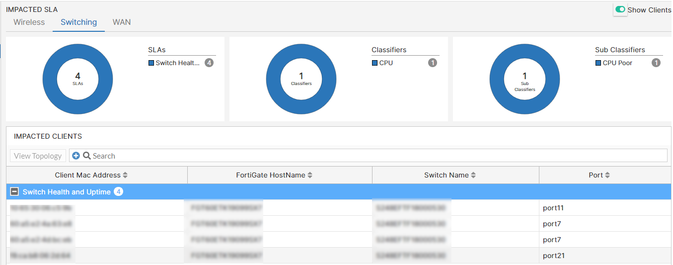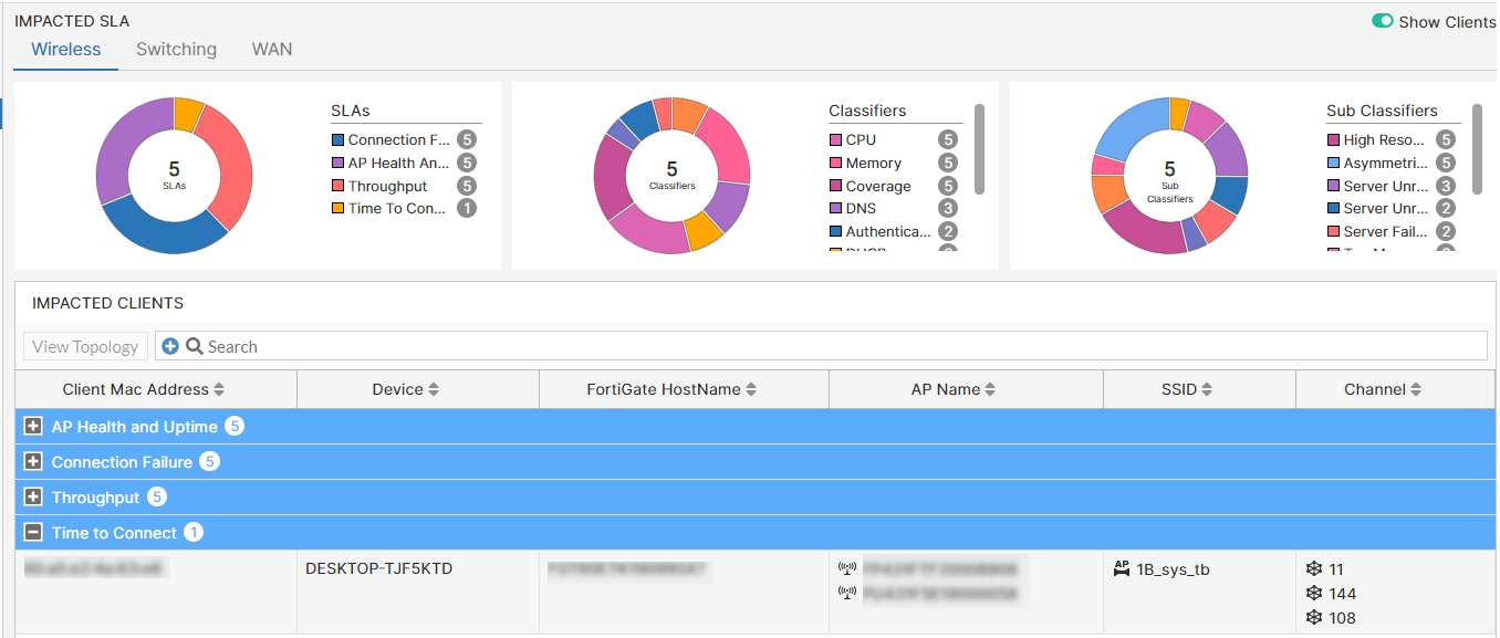 This page displays the impacted wireless, switching, and WAN clients, categorized based on their SLAs, classifiers, and sub-classifiers. Select any SLA and the associated classifier and sub-classifier charts are displayed. You can filter and view the SLAs as per any of these categories. In each impacted SLA panel for wireless, switching, and WAN, you can select Show Clients to view the impacted client count or click Show Devices to view the impacted device count. Navigate to Monitor > Impacted SLA.