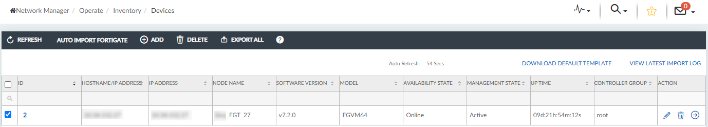 The Devices inventory lists all the devices in the wireless network inventory managed by FortiWLM MEA. Each of the devices are listed in table rows with their details summarized. You can Add devices, and Delete or Export devices from the Inventory on the Devices dashboard. You can also Edit an existing device or navigate to the device GUI to manage it directly.
