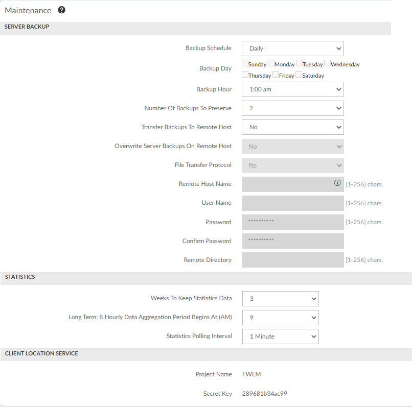 The Maintenance screen displays the server maintenance parameters of FortiWLM MEA. You can access the Maintenance screen through Administration > System Settings > Maintenance.