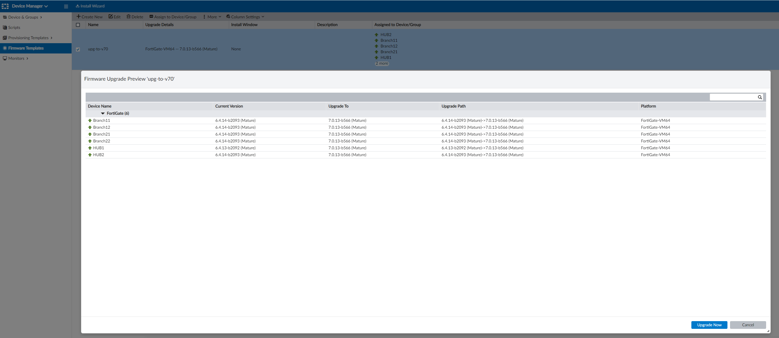 This example uses FortiManager 7.0.10. For more information, see the FortiManager 7.0.10 Upgrade Guide. - Using FortiManager Firmware Templates, upgrade FortiGate devices to the latest 7.0 version.