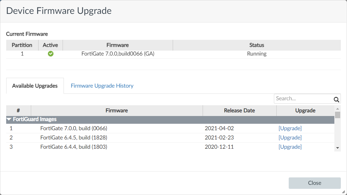 The Device Firmware Upgrade dialog box displays a list of images retrieved from FortiGuard.