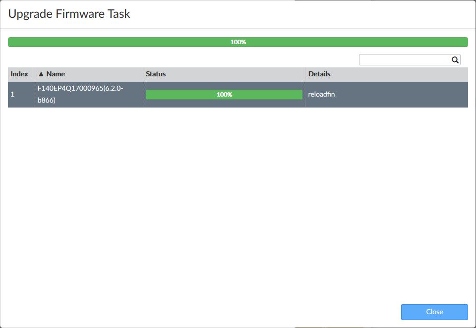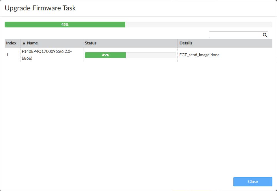 The firmware downloaded from FortiGuard is used, and the upgrade starts.