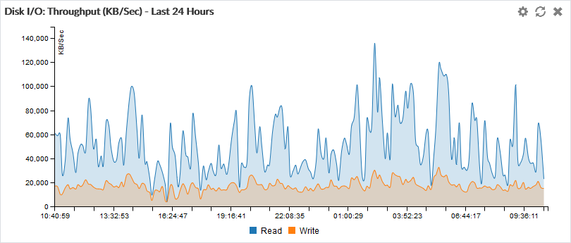 The Disk I/O widget shows the disk utilization (%), transaction rate (requests/s), or throughput (KB/s), versus time.