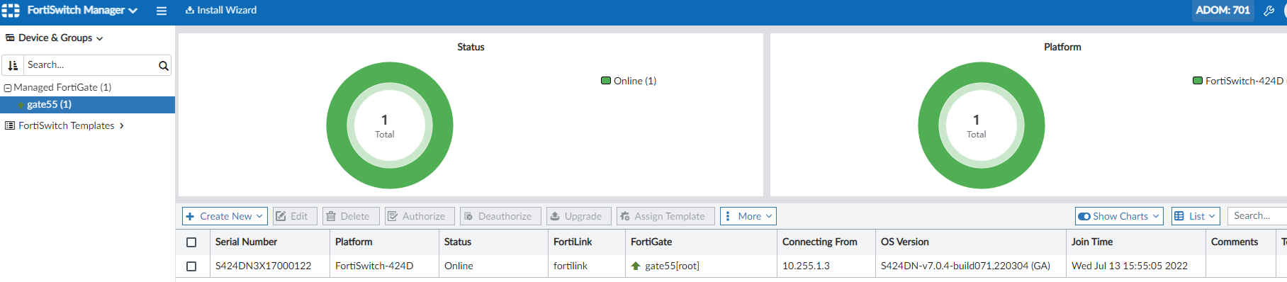 - Go to FortiSwitch Manager > Device & Groups, and select a managed FortiGate.