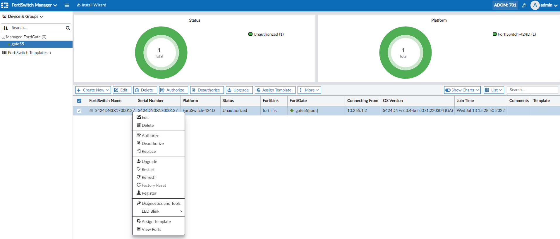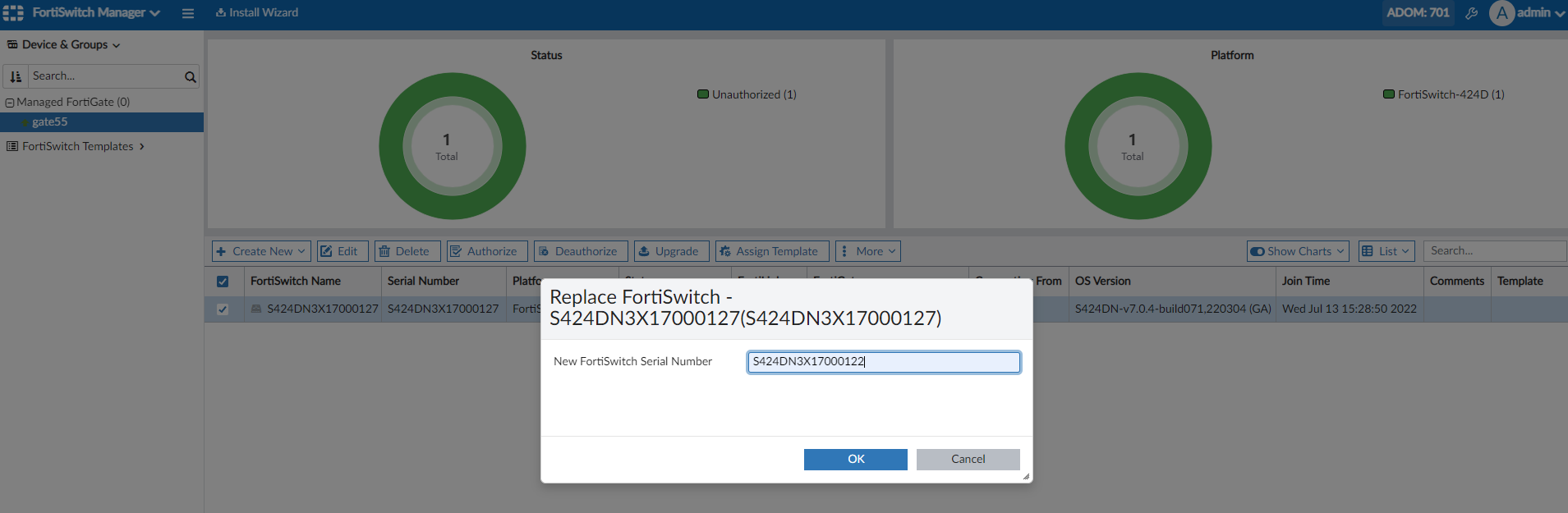 - When the device's status is Unauthorized, right-click on the same FortiSwitch device and click Replace.