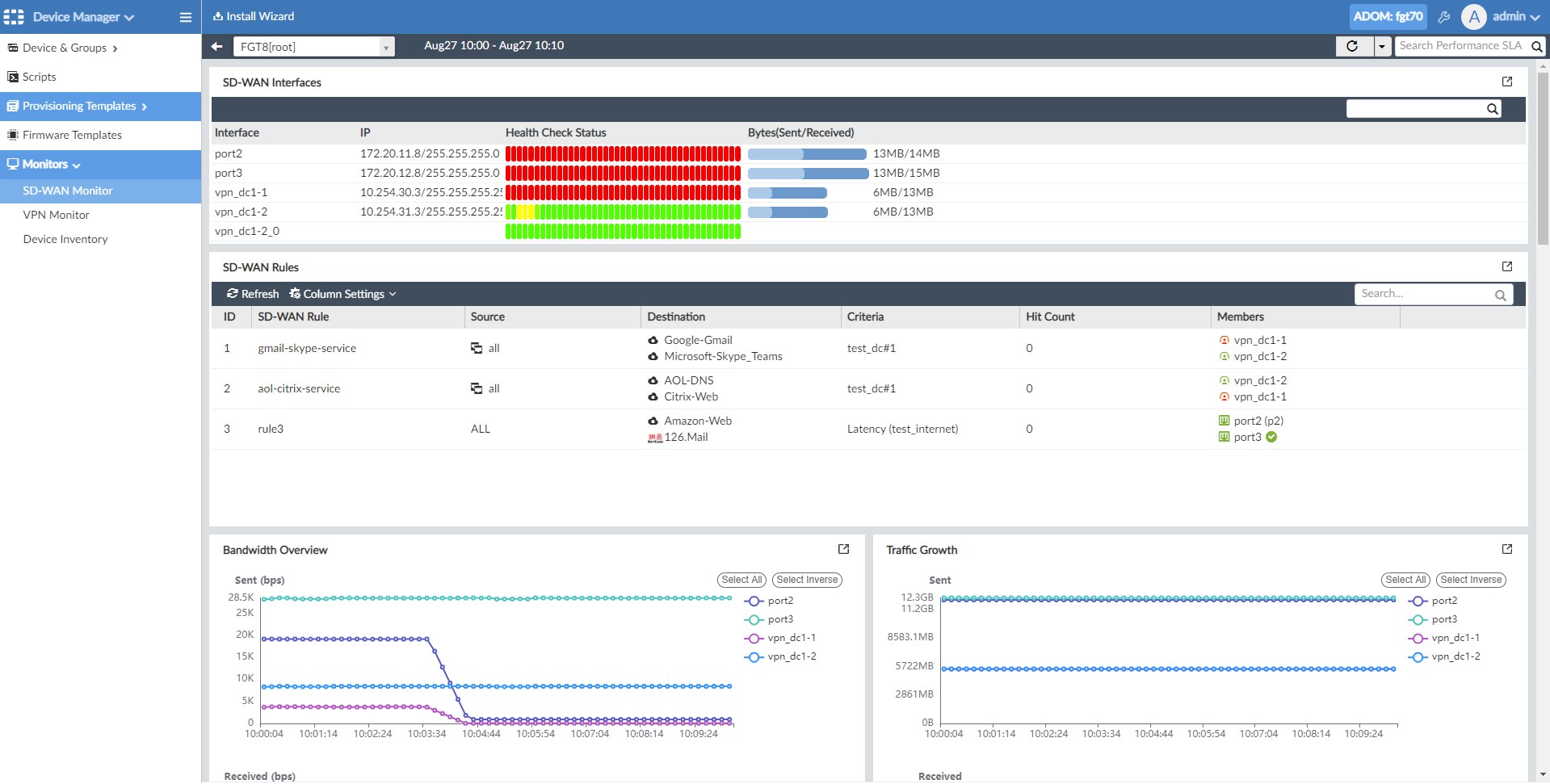 By default, SD-WAN Monitoring History is disabled. When this feature is disabled, data for only the last 10 minutes is displayed. You can refresh to view the data directly from FortiGate devices. No historical data is stored in FortiManager when this feature is disabled.