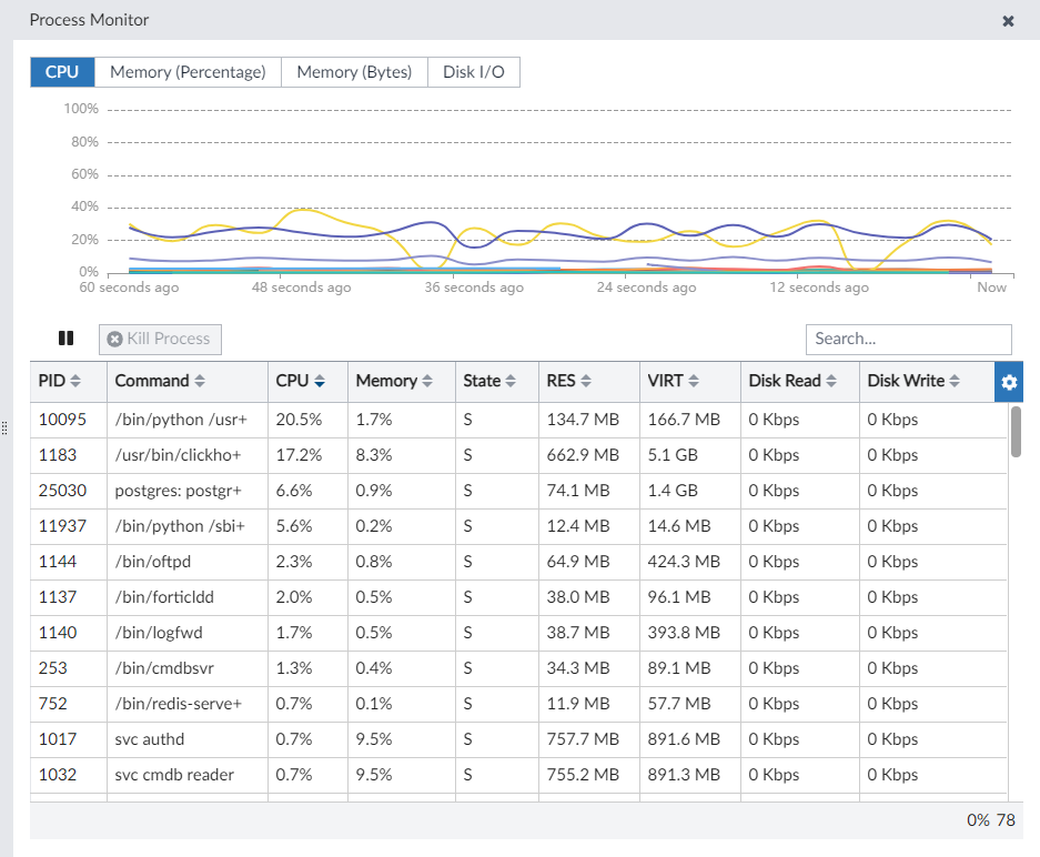 The Process Monitor displays running processes with their CPU and memory usage as well as their disk I/O levels. Administrators can sort, filter, and terminate processes within the Process Monitor pane.