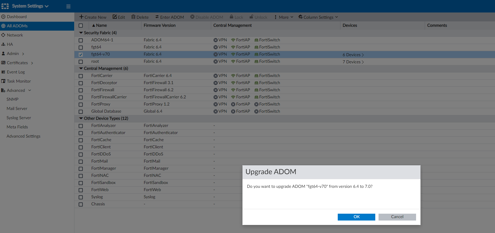 - Upgrade the ADOM to version 7.0. For more information, seeUpgrading an ADOM.