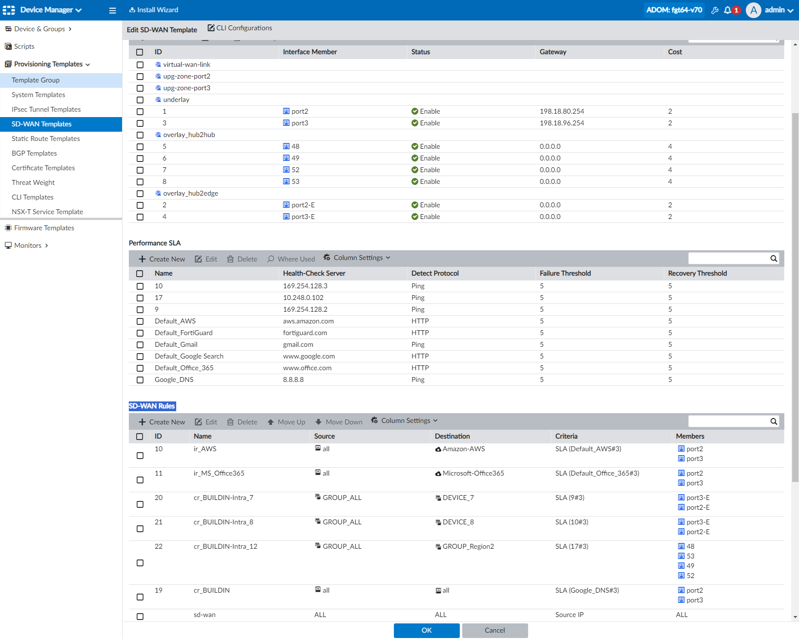 When comparing the SD-WAN templates imported from hub1 and hub2, there are a number of differences. As a result of these differences, and the templates cannot be combined into a singular template for hubs. An example of the differences between imported templates include:- In Interface Members > Underlay, there are different gateways.