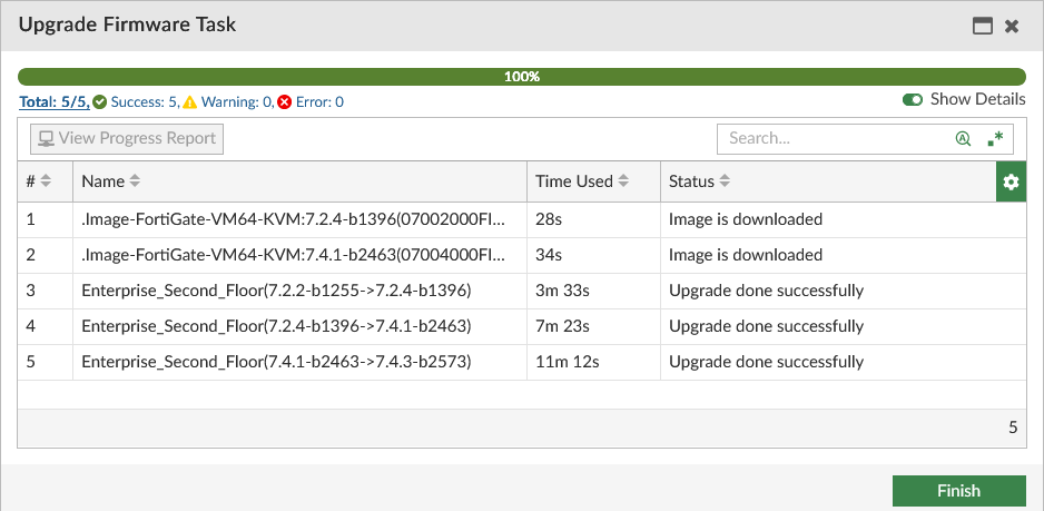 When using FortiManager to upgrade firmware on FortiGate, FortiManager can choose the shortest upgrade path based on the FortiGate upgrade matrix. In a multi-step firmware upgrade, each upgrade is a subtask. You can also enable the option to skip all intermediate steps in an upgrade path when available. See Upgrading firmware.