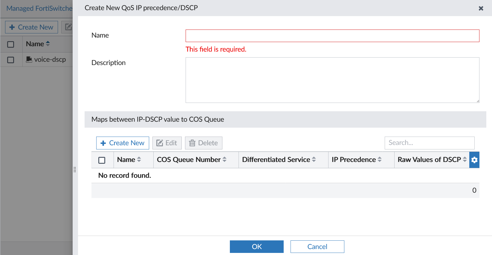 - Go to FortiSwitch Manager > Managed FortiSwitches, and select IP Precedence/DSCP from the QoS tab.