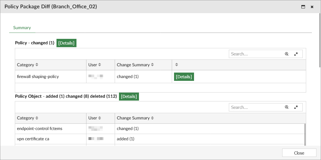 - In the Category row, click the Details link to display details about the specific policy changes.