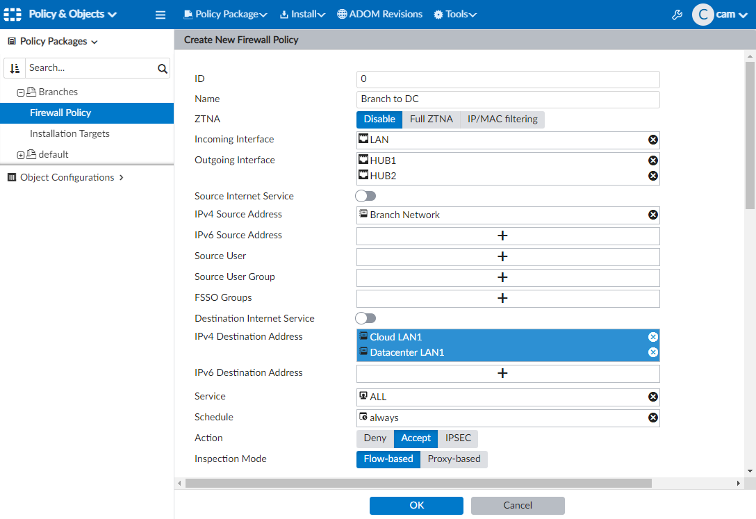 - In the HUB policy package, create a firewall policy named Branch to Datacenter: