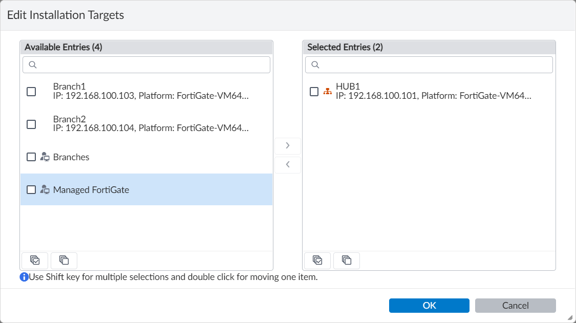 In the Available Entries list, select the HUB1 device, and click the right arrow (>) to move it to the Selected Entries list.