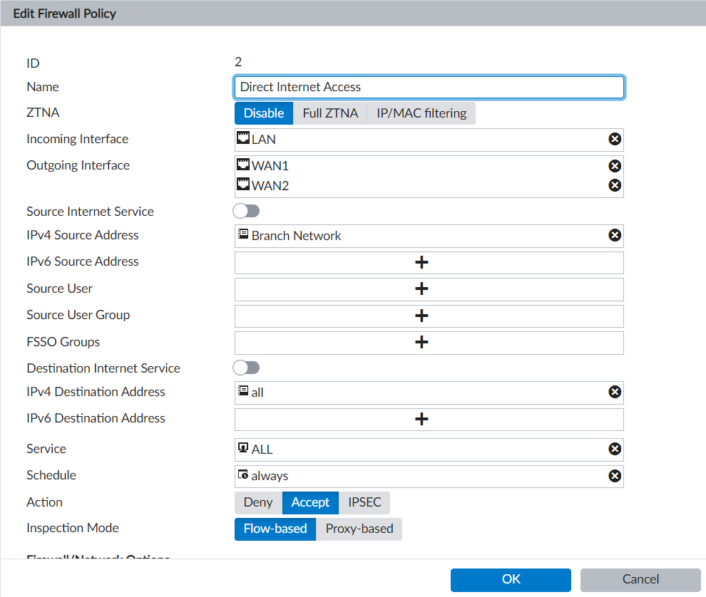 - In the branches policy package, create a firewall policy named Direct Internet Access: