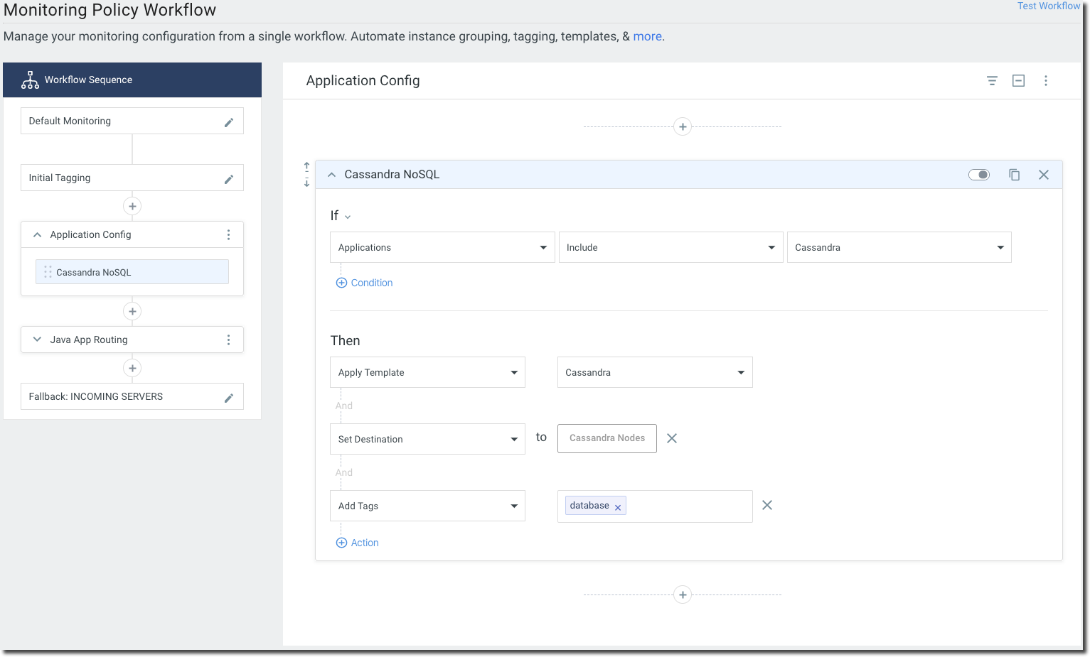 Managing monitoring configuration at scale is often onerous, especially in diverse environments with many types of applications and technologies. To handle this, managing monitoring configuration as part of the build and release process is often viewed as the end-goal. However, many companies are far from ready for this, for various reasons. Thankfully, your Monitoring Policy enables you to manage your monitoring configuration from a central location using a workflow-like interface.