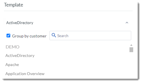 Enabling the Group by customer option displays all of the available dashboard templates that you have access to and sorts the list by customer name. This allows you to accurately identify the source of the template.