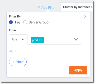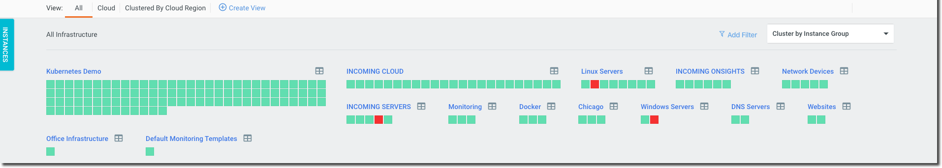 Clusters are logical groupings of your infrastructure. By default, your instances will be clustered by instance group. Using the Clustering selector in the top right corner, you can cluster infrastructure using a number of options: