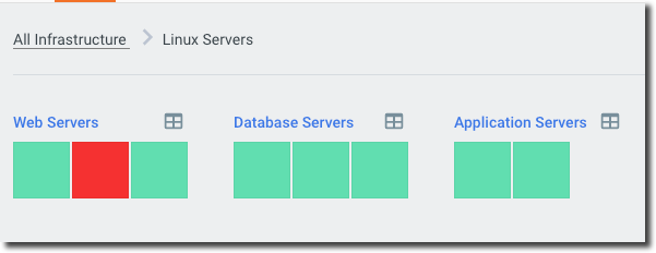 The Infrastructure Map is a high-level view of the health of your account that lets you cluster and explore the health of your nodes dynamically, helping you identify problematic hotspots in your infrastructure. The Infrastructure Map is the default page you will land on when visiting FortiMonitor unless you have a default dashboard set. Otherwise, it's available under the Monitoring navigation item.