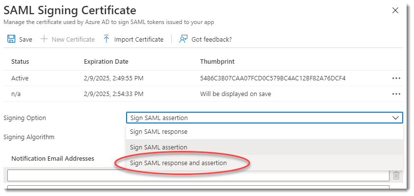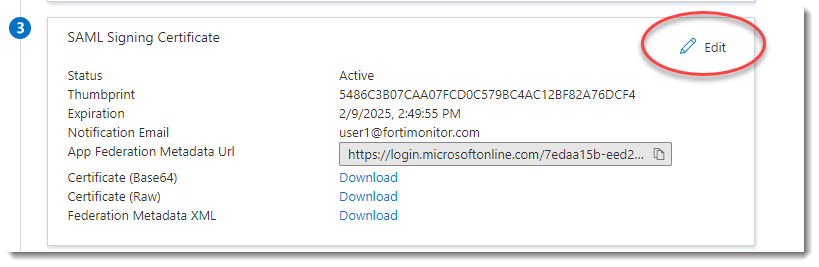 To create a new SAML signing certificate, click Edit in the SAML signing certificate section.