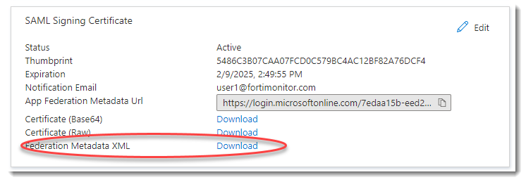 From the SAML Signing Certificate section, click Download to download the Federation Metadata XML.