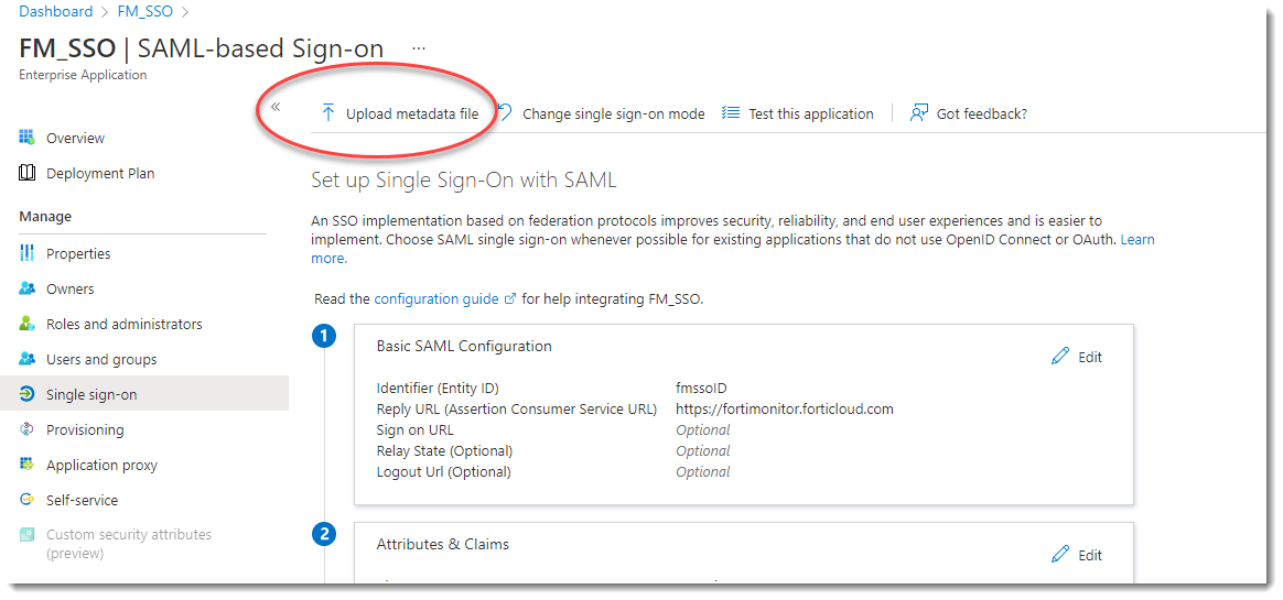 Go back to Azure and upload the metadata file. From the Application created previously, upload the metadata.xml file.
