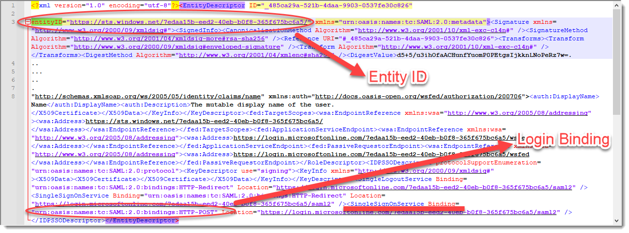 The Entity ID and the Login Binding can be found in the Federation Metadata XML file that you downloaded from Azure.