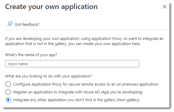Enter a name for the application then select Integrate any other application you don't find in the gallery (Non-gallery).