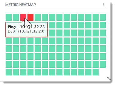 Use the Metric Heatmap for quick visual indicators on the current health of metrics. Each cell represents a specific metric and cells will remain green if the current status is healthy, otherwise red or orange depending on the severity of an active incident for that metric. Hovering over the cell will provide details on that metric and instance. Like most widgets, you can scope the results to specific instances and metrics using a variety of filtering options.