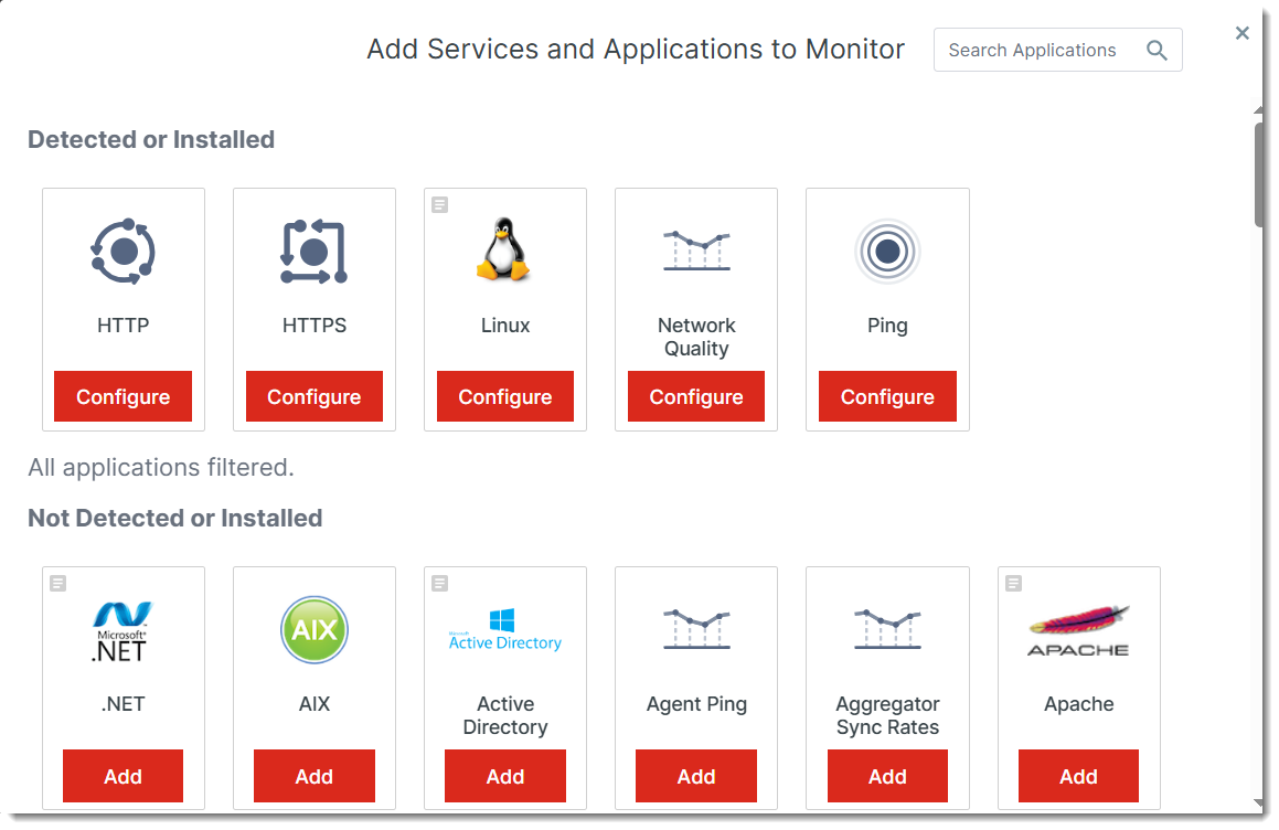 The Add Services and Applications to Monitor modal is displayed. This modal shows you the checks you already have configured, the services detected on the server that are available to be monitored, and the rest of the catalog of available checks and plugins.