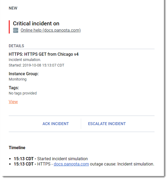 You can see the affected service, the group the instance belongs to, the severity, and when the incident started in the first part of the email. The Timeline section shows you when and where the incident originated.
