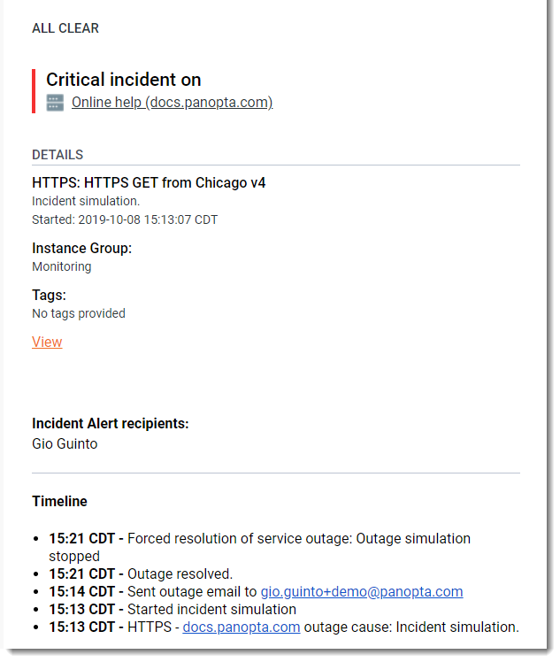 Once the incident has cleared, if you have enabled All Clear in the Alert Timeline for the instance, you will receive an email like the following.