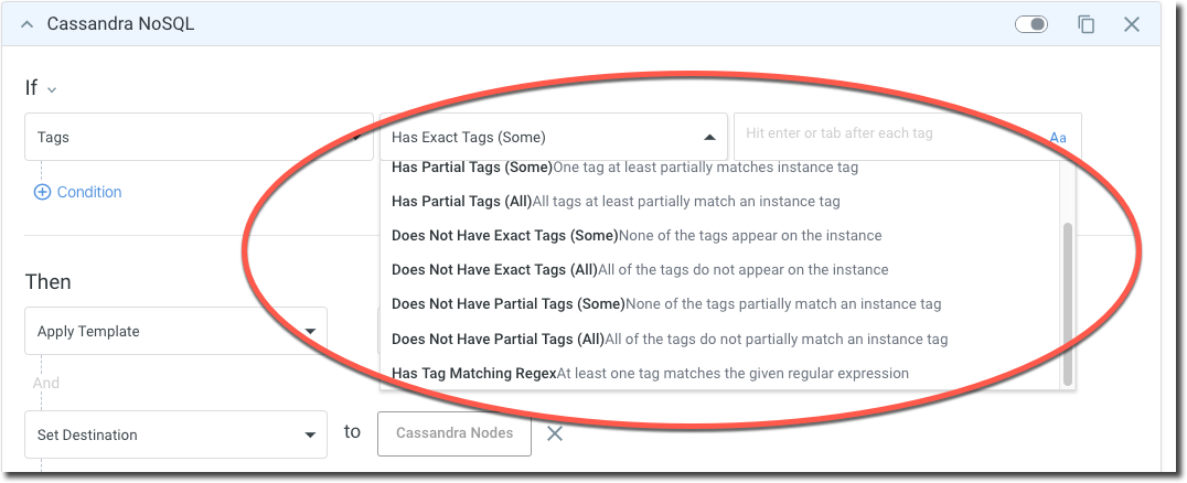 Instances that have at least one tag that partially matches the entered tags will be included in the ruleset.