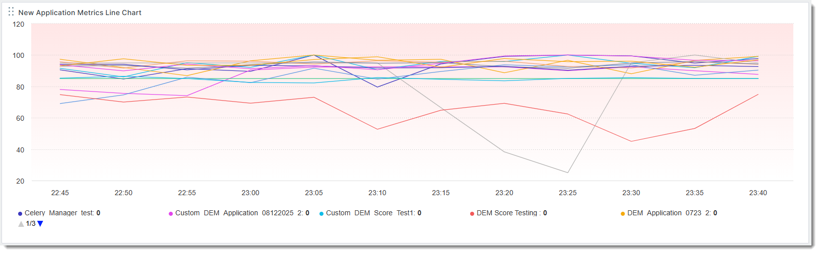 The Application Metrics Line Chart visualizes DEM metrics for each application over time.