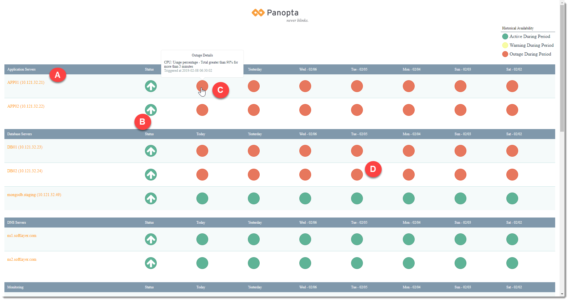 The performance of an instance over the past week. A green dot indicates that your server was up all of that day, a yellow dot indicates that there was at least one alert, and a red dot indicates that there was an outage. |