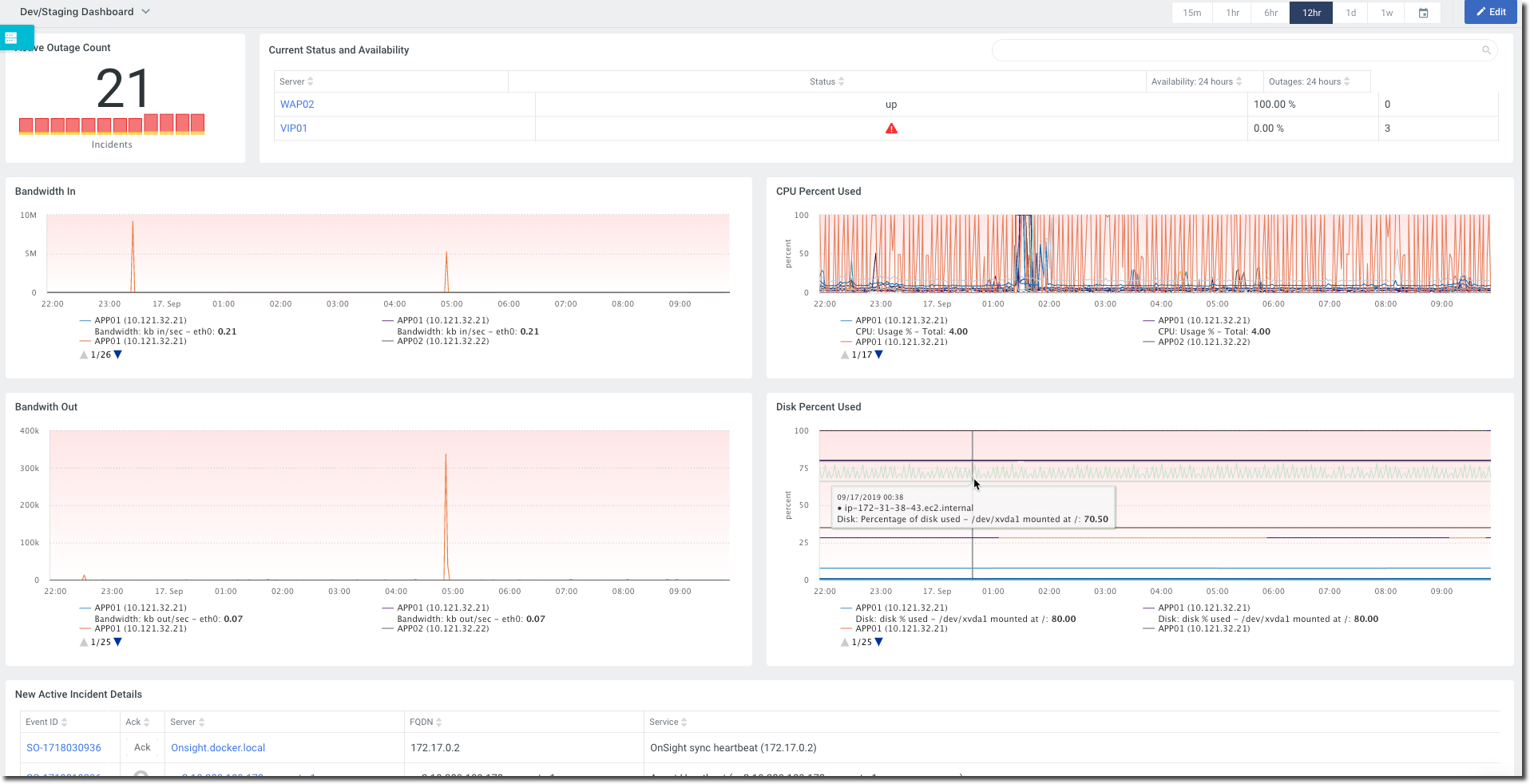 The Dashboard is a powerful mechanism for displaying and visualizing the various streams of data that are being captured by FortiMonitor. The Dashboard can be configured easily and uses a simple drag and drop builder for widgets in order to achieve the layout you require. In addition, each of the widgets has several options for controlling different elements ranging from formatting, data selection, filtering, and data aggregation.
