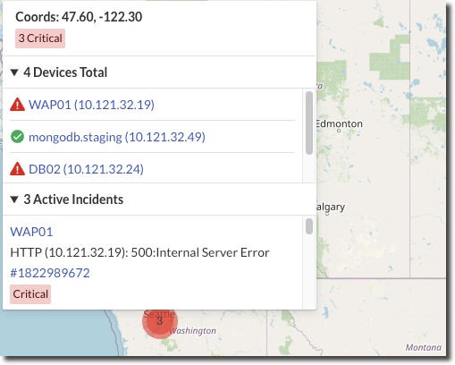 Each geographic location is represented by a color-coded marker that shows the number of incident for that particular region. The color of the marker is based on the severity of the incidents (Warning or Critical).