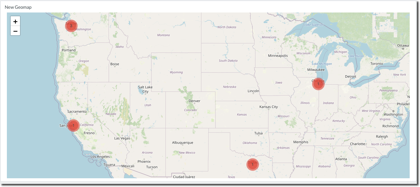 Use the Geomap widget to display a rollup of incident counts by geographic location. Similar to other widgets, the Geomap widget can be scoped by instance (tag, group, or name) and by metric type. Geographic location data is entered on an instance’s Details tab in the Instance Location field.